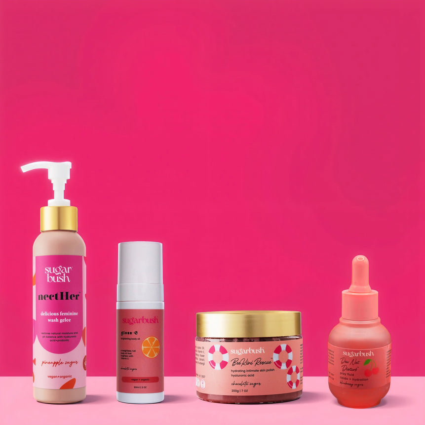 Treat yourself, or someone you love, to a gift sweeter than a box of chocolates (and better for your waistline, too!) Our bundle includes our hydrating nectHer wash in Chocolate Sugar, Beekini Rescue hydrating intimate polish, Gloss-C weightless body oil and Dew Not Disturb Play Oil in Blueberry Sugar.