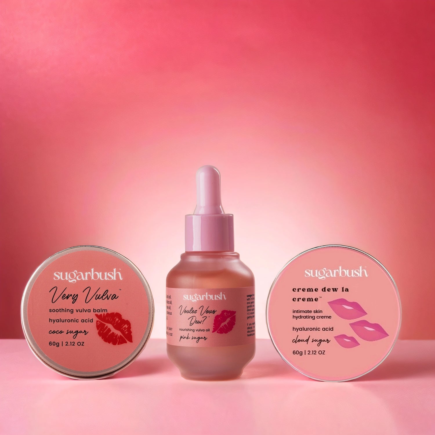It's our birthday, and we're celebrating YOU with a bundle of Sugarbush best sellers. For the girl who wants it ALL, this bundle includes a complete intimate skin care routine, in addition to our best selling Dew Not Disturb play fluid for your private moments: